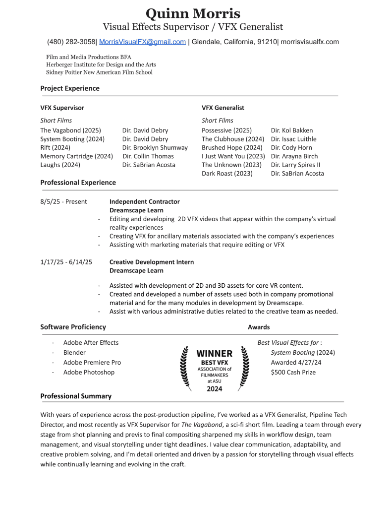 I’m Quinn Morris, a VFX Supervisor and Generalist driven by a passion for collaborating with talented creatives to bring unique ideas to life. I thrive on crafting visually stunning projects that leave a lasting impression. Below, you’ll find highlights of my past work but I’m always eager to take on fresh challenges.